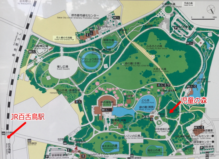 遊具広場はその中の「児童の森」という場所にあります。(上の地図は南北が逆。JR百舌鳥駅は東側にあります)