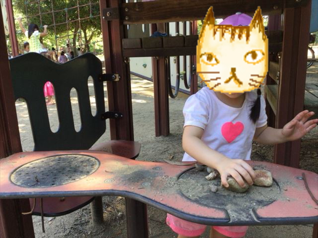 アスレチック型遊具の下には料理ごっこができるスペースが。どんぐりや木の枝や石で料理を作ったりしてました。