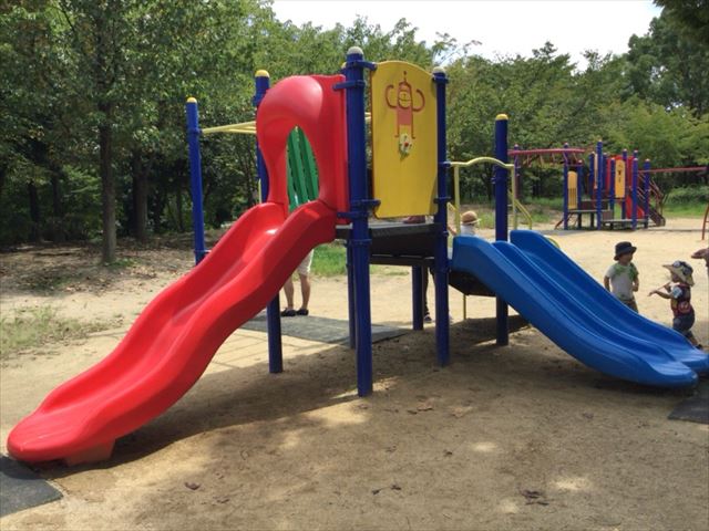 手前は簡単な青色の滑り台、反対側には黄緑色の滑り台があります。