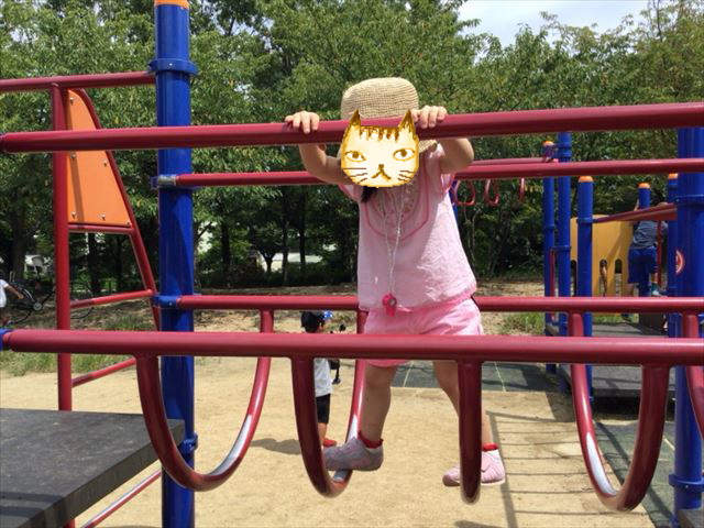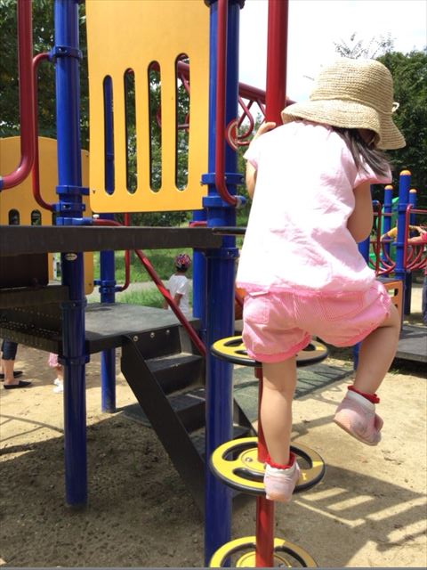 この写真左側の雲梯は小学生向き。幼児には届きませんでした。