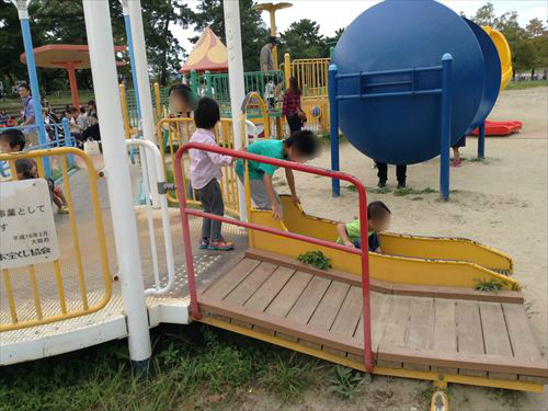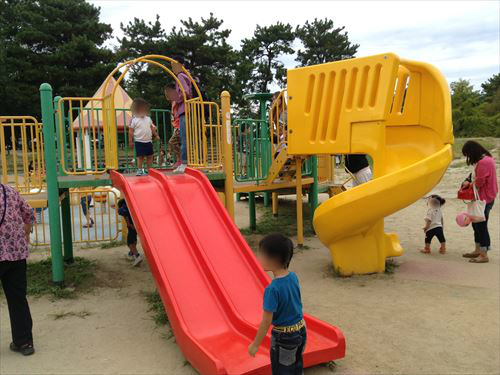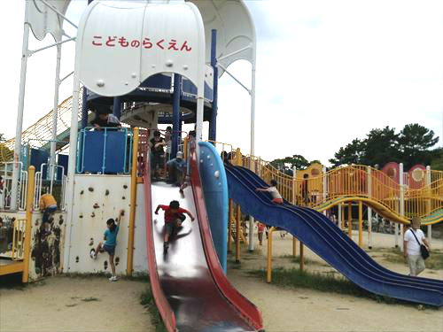 服部緑地内の大型遊具公園「こどもの楽園」に着きました。昨日は涼しかったのでたくさんの家族連れが来ていましたよ。
