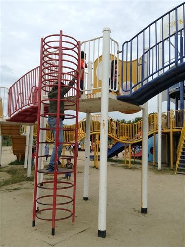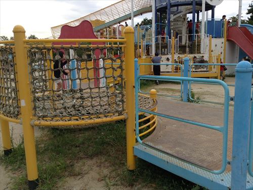 赤い滑り台が1つ、青い滑り台が3つ、そして緑の滑り台は滑るというよりは、上り専用になっています。黄色の橋で繋がっています。