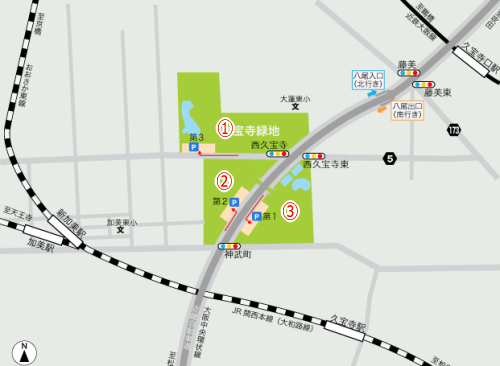 久宝寺緑地内の地図、車の場合の駐車場、電車&徒歩で行く場合をまとめました。
