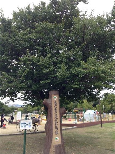 もくもく元気広場に着きました。本物の木と重なっていて面白い目印です。