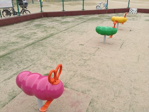幼児向けの固定乗り物が3つ。これはなんでしょう。ミノムシ?エビフライ?