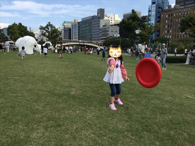 中之島公園を天満橋方面に少し行くと、芝生広場が一面にあります。その芝生で先週は子供とフリスビーとかけっこをして遊びました。