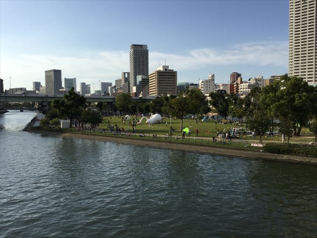中之島公園の芝生広場の様子がよくわかる写真ですね。土佐堀川の天神橋から撮影。