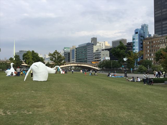 中之島公園の芝生広場と土佐堀川