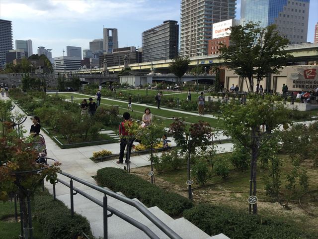 北浜駅からの行き方は、地上に出ると難波橋があるので、その少し東側(橋の右側)にバラ園があり、そこを超えると芝生広場があります(阪神高速道路をくぐったところ)
