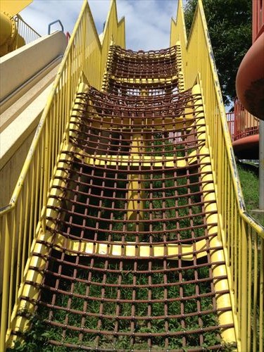 黄色い滑り台横の縄はしご「ネットロード」。上からの眺め。