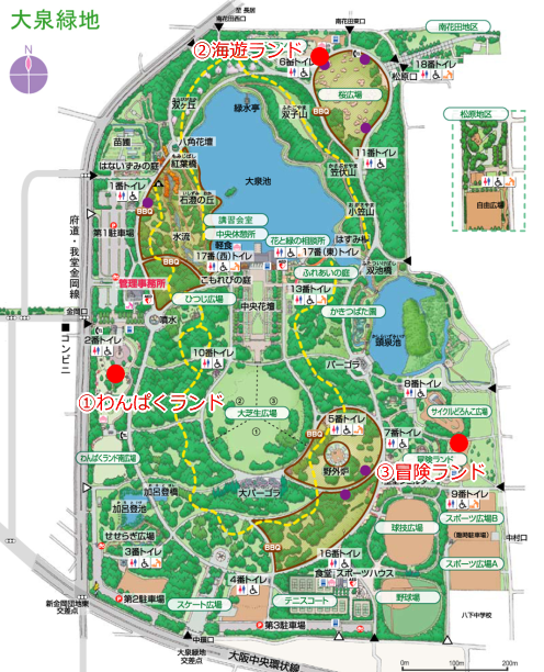 ③冒険ランドは大泉緑地の東側にあります(上の地図③を参照)。