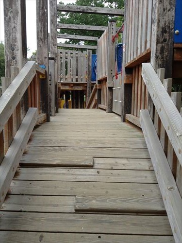 大型滑り台の横を歩くと、木の遊具があります。小さな滑り台や縄はしごなど凝ってます。