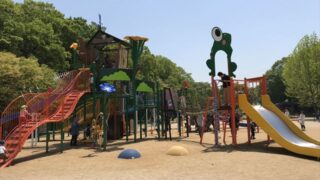 ロングスライダー(滑り台)やアスレチック風ジャングルジムなどの遊具、目の前にある芝生広場、展望台については下の記事をどうぞ▼