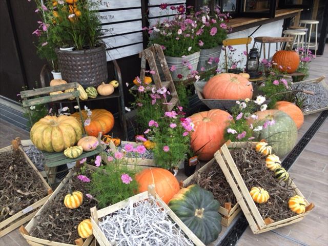 季節の花や野菜が店頭に飾られています。植物のアレンジが中心なので入れ物もセットで売られていました。