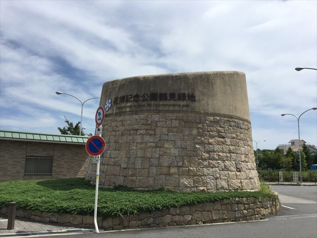 金剛寺を抜けると「花博記念公園鶴見緑地」の表示と北西駐車場が見えてきます。