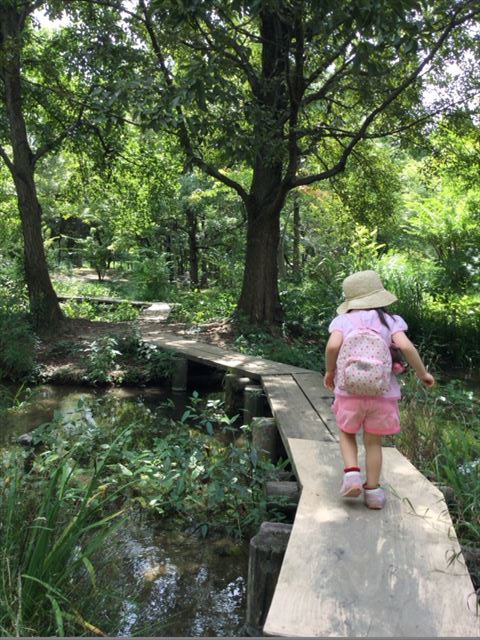 緑のせせらぎの橋を渡る子供