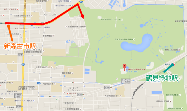 上のGoogle Mapを拡大させました。電車で行く場合、地図右側にある長堀鶴見緑地線「鶴見緑地駅」下車が一般的ですが、鶴見緑地公園内の広さにビックリ!